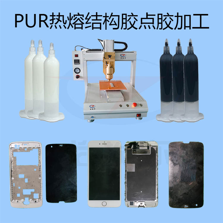 PUR熱熔結構膠點膠加工所用的濕氣固化PUR熱熔膠,是一種電子結構膠,主要應用于手機邊框與TP觸摸屏粘接、智能穿戴設備外殼粘接、平板計算機邊框與觸摸屏粘接、窗口粘接、外殼結構粘接、電池粘接、觸摸屏組裝、鍵盤粘接、平面密封、PCB組裝和保護等等。